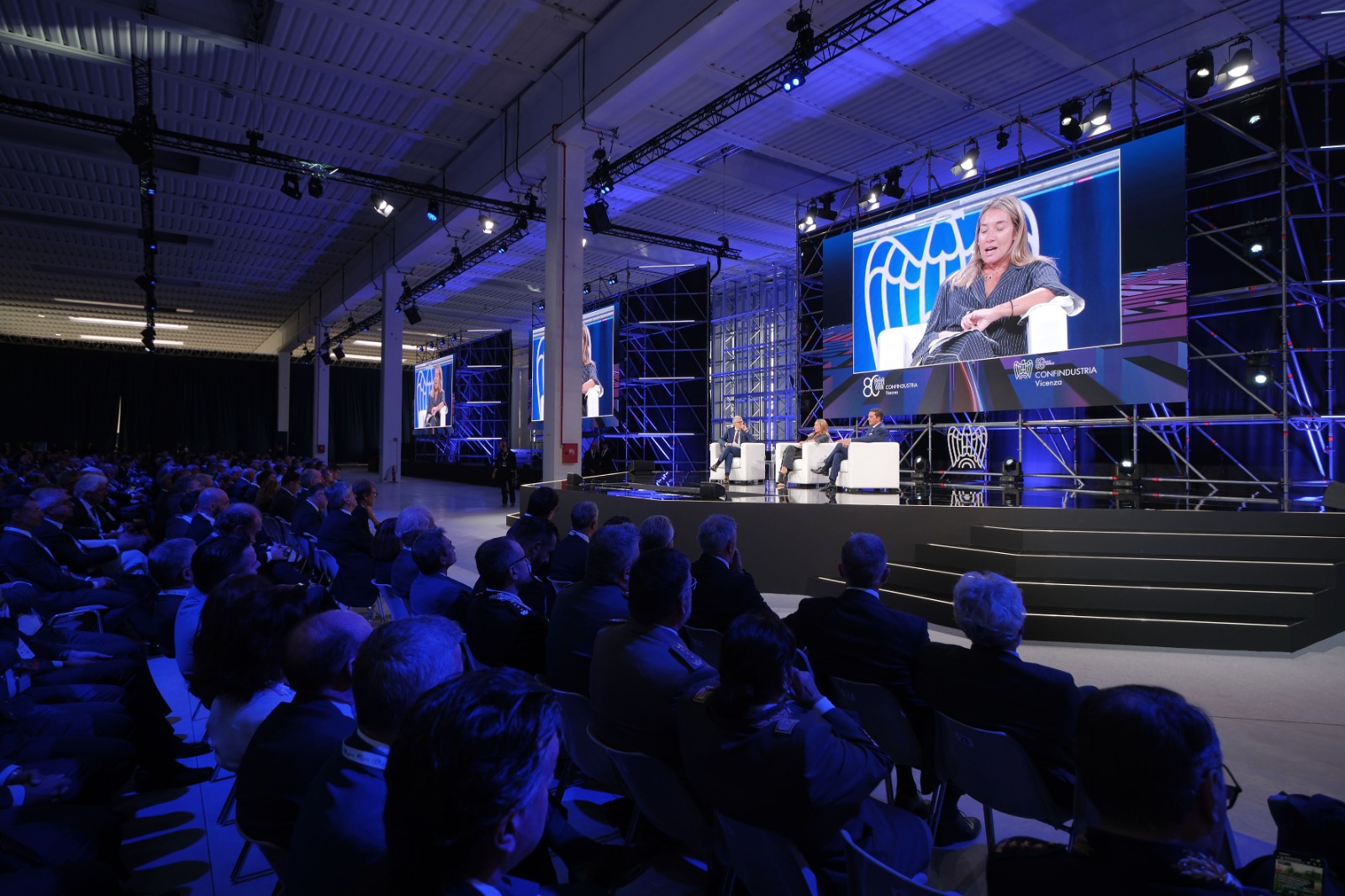 Platea quindi gremita di imprenditori, e interventi sul palco anche del presidente nazionale di Confindustria Emanuele Orsini, del presidente del Veneto Luca Zaia, del ministro delle imprese e del Made in Italy Adolfo Urso.