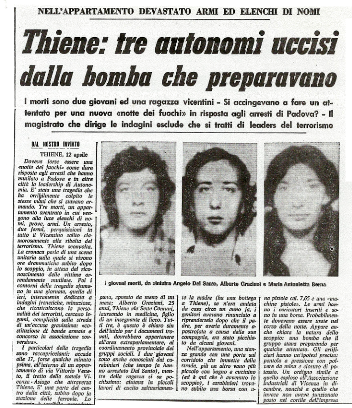 Oggi ricorre l’anniversario dell’esplosione in cui persero la vita Antonietta Berna, Angelo Dal Santo e Alberto Graziani. Una tragedia maturata nel clima della violenza politica di quegli anni e destinata a segnare per sempre anche la vicenda di Lorenzo Bortoli.
