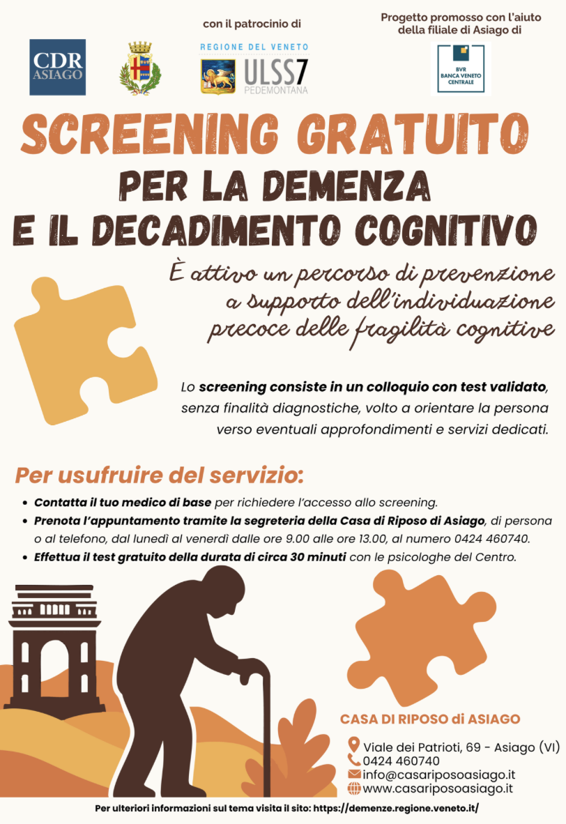 L’iniziativa a supporto della diagnosi precoce promossa dal Comune di Asiago in collaborazione con l’Ipab dell’Altopiano, con il patrocinio dell’Ulss 7, prevede la somministrazione di un test validato da parte delle psicologhe del Centro di Viale dei Patrioti, su invio del medico di medicina generale, allo scopo di individuare eventuali indicatori di decadimento cognitivo e orientare la persona verso gli approfondimenti diagnostici o i servizi sociosanitari più appropriati, in raccordo con la rete territoriale esistente. Lo screening non ha finalità diagnostiche, ma costituisce un primo livello di valutazione, utile a favorire una maggiore consapevolezza e un accesso tempestivo ai piani di cura.