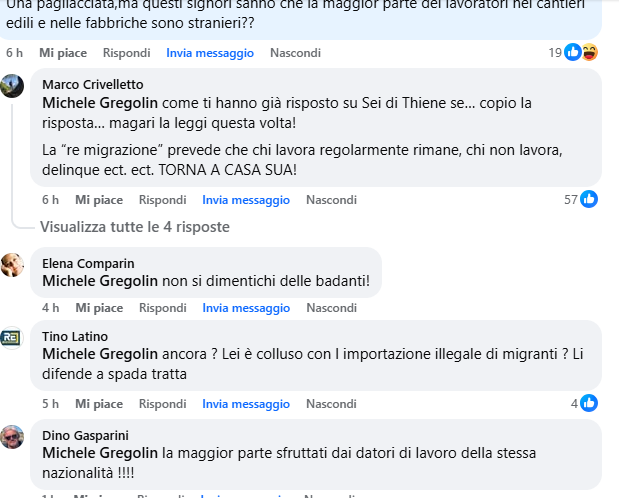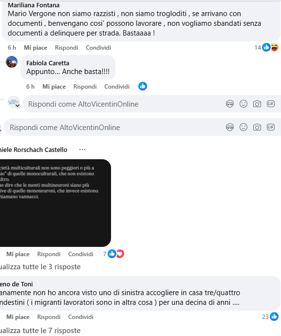 Qualcuno fa notare che a Thiene la presenza di immigrati irregolari non appare così marcata e che a Schio la situazione sembra fuori controllo. Qualcun altro, invece, chiede dove poter firmare e di condividere l’iniziativa popolare. Il tema dell’immigrazione resta un tema che fa discutere e qualcuno scade nel razzismo senza riuscire a confrontarsi.