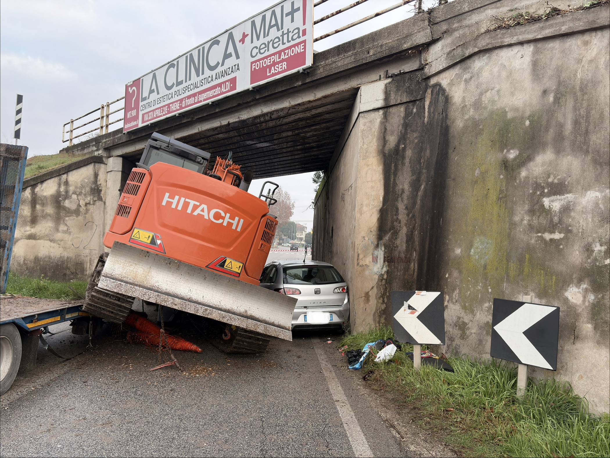 Secondo le prime ricostruzioni, il braccio dell’escavatore, caricato sul pianale, ha urtato contro la struttura del ponte. Un impatto fortissimo, che ha fatto staccare gli ancoraggi del mezzo, facendolo scivolare giu, fino al ribaltamento laterale dell’escavatore che è crollato sopra una vettura, che stava passando proprio in quel momento nel sottopasso ferroviario.