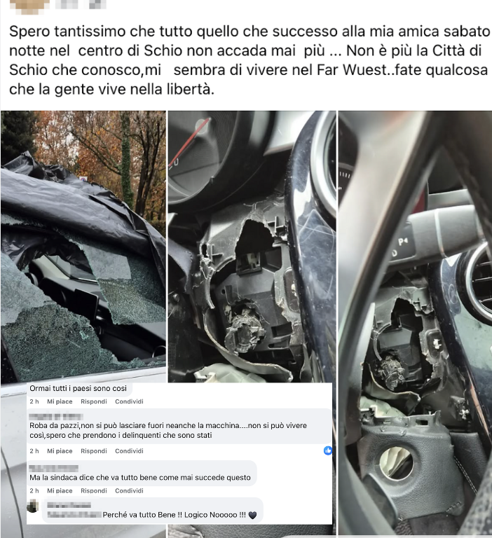 Sabato notte, auto vandalizzata. Tra dichiarazioni, prese di posizione e tensioni che si accumulano, a Schio il tema della sicurezza è scivoloso. Un argomento che dovrebbe unire, ma che puntualmente diventa spartiacque quando la politica entra prepotente nella vita quotidiana. Schio si prepara, ancora una volta, a misurare la distanza tra ciò che è percezione e ciò che è realtà. Sui social, sotto alla foto di un’auto vandalizzata la notte del sabato scorso nelle vicinanze di piazza Bao, i commenti sono diretti anche a  chi la città la guida: “ma la sindaca dice che va tutto bene, come mai succede questo?”
