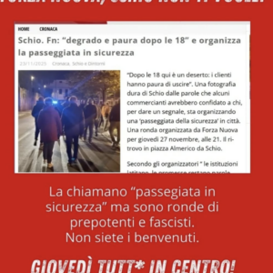 -Mancano pochi giorni alla ‘passeggiata per la sicurezza’ annunciata da Forza Nuova nel centro di Schio e l’atmosfera, in città, si sta già scaldando. All’appuntamento di giovedì 27 novembre risponderà anche... continua a leggere...